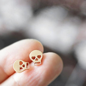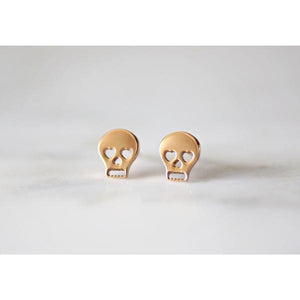 Skull stud earrings with heart eye features, handmade in the Netherlands. These earrings are made from Stirling Silver and plated with rose gold/gold and buffed for a smooth shiny finish.The skull is 6mm in length.