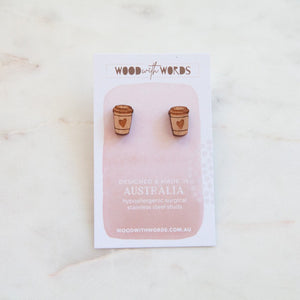 Add some fun and uniqueness to your style with our stylish range of coffee cup wooden stud earrings. These earrings are designed and made in Australia from beautiful cherry wood grain veneer, making them a perfect gift idea for that person who may just have everything! Our quirky range of stud earrings are a must-have accessory for any fashion lover. Even better they have surgical steel posts for those with sensitivities.
