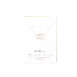 Silver plated heart necklace from the Kaisercraft Style Collection. This heart necklace  is presented on a gifting card with the saying "Mother - Mother's hold their children's hand for a moment and their heart's for a lifetime".
