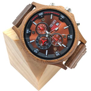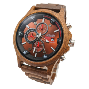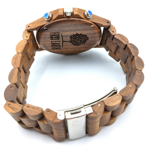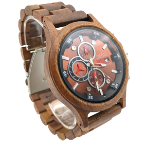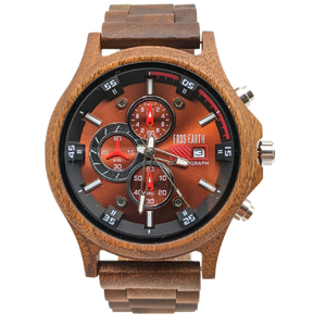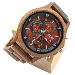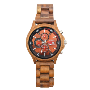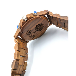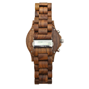 A beautiful wooden chronograph watch made from a walnut and ebony wood. This watch features a multi-functional Quartz movement, push to close clasp and is splash waterproof. Presented in a stylish box, ready for gifting and includes a band adjustment tool and full instructions.